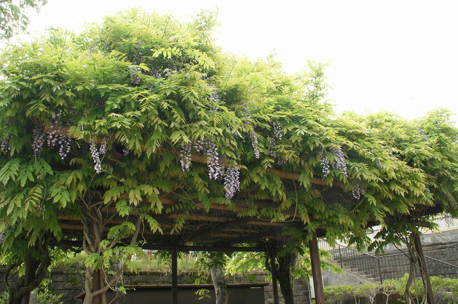 衣川台地児童公園(通称 南公園)で、藤棚の花が見頃です。昨日の強い雨で少し花が散ってしまいましたが、まだまだ見頃です。